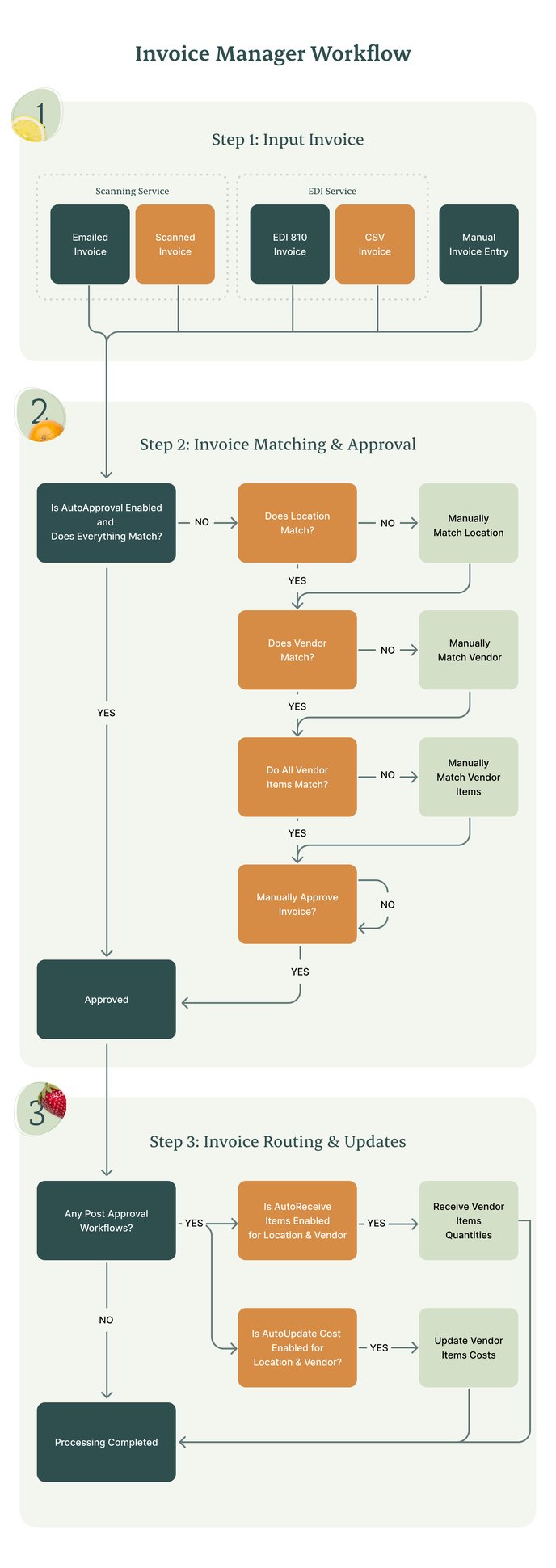 There are three steps to the Invoice manager workflow, listed below and then illustrated with flowcharts.