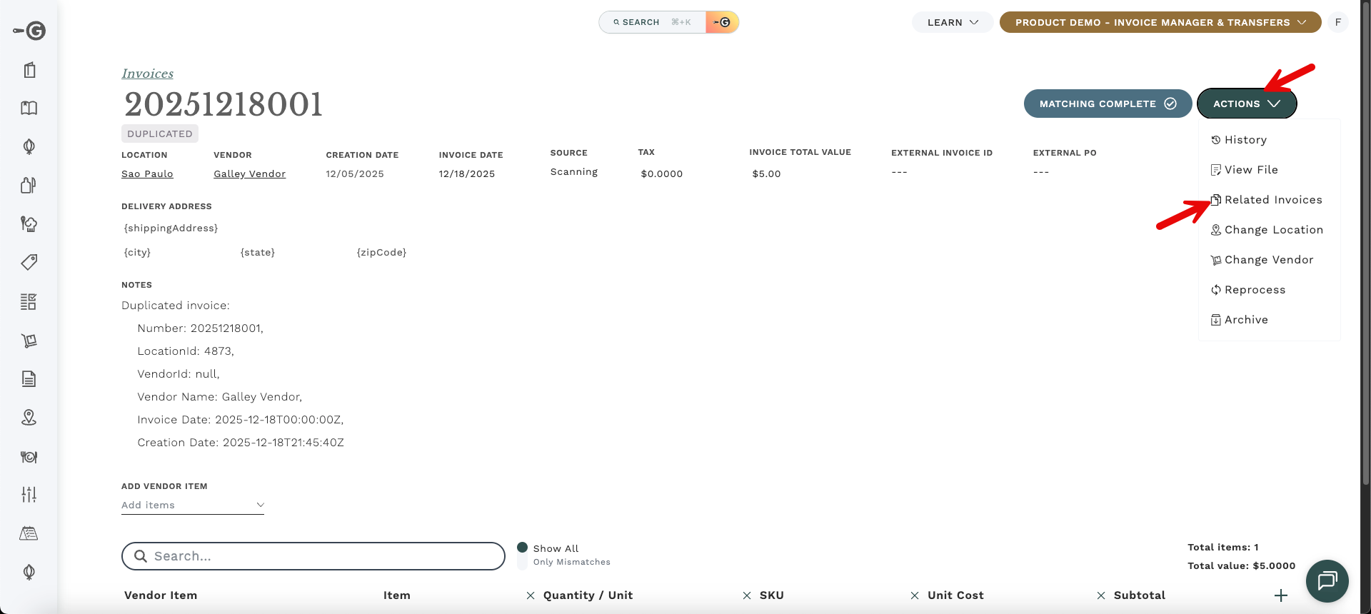 A Duplicated Invoice occurs when you receive an invoice from the Same Vendor, to the Same Location, with the Same Invoice Number. To keep your food costs accurate and prevent "double counting" your inventory, Galley automatically flags these extras as duplicates.