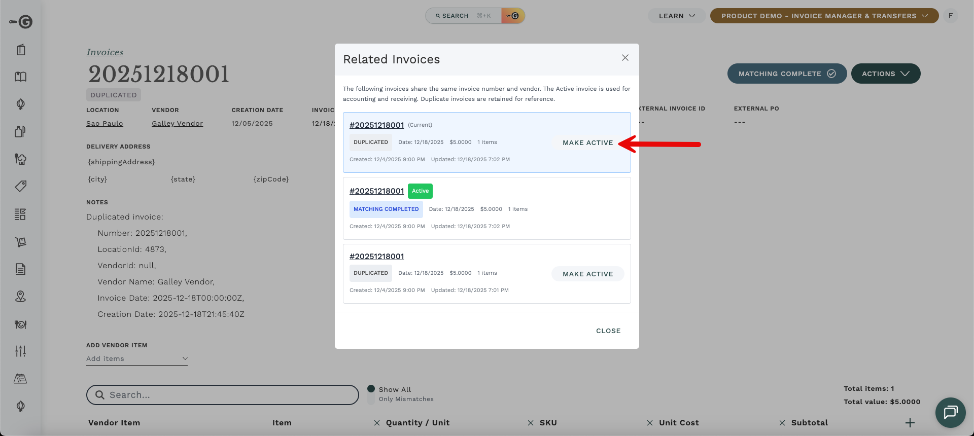 ✨ What's New: You are now the Expediter! You have full control to select which invoice should be the Active one (used for receiving and costs) and which ones should be discarded as duplicates.