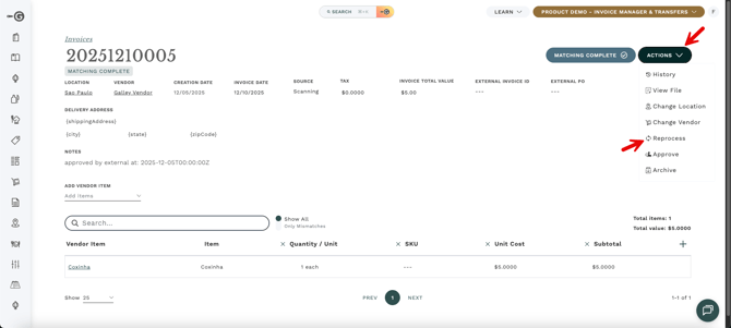 🚀 What’s New Sometimes you update a recipe, and you need the system to catch up. You can now force an invoice to "Reprocess." This is great for when you’ve mapped a new vendor or item and want old invoices to recognize the new data.