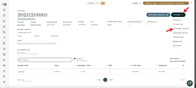 2. Change Invoice Location Invoice landed at the Downtown location but belongs to Uptown?