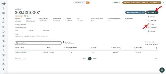 Result: The invoice moves back to "Matching Complete." All inventory movements and cost updates are reverted, allowing you to edit and re-approve.