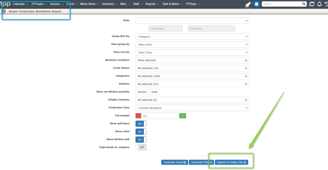 To get your event data for Galley import, you'll need to export the Galley Formatted Master Production Worksheet Report from Total Party Planner.
